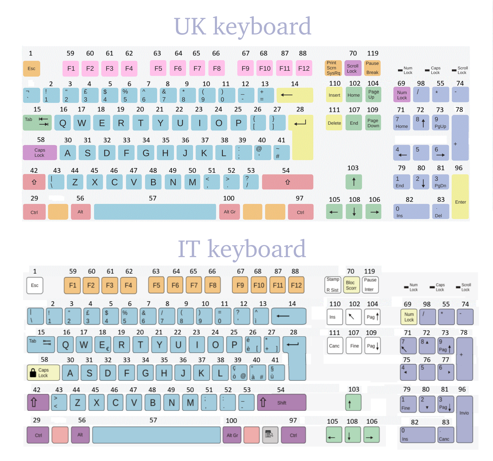 The keyboard map and the keycodes were obtained in various ways through online searches and tests; they are certainly not 100% accurate. The map helps to understand what value the key position on your keyboard sends to the system, which will then display the symbol according to the keyboard layout. The keyboard functionality sends the key position value, not the associated symbol.